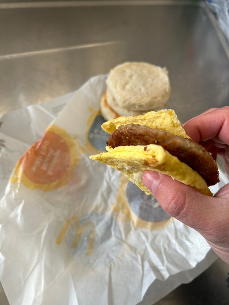 Ordering like this will cost you about $4.08 rather than paying $5.49 (prices vary by location) for the Sausage Biscuit with Egg. If you’re cool with the carbs, you can assemble your own Sausage Biscuit with Egg and save $1.41 while getting an extra biscuit.